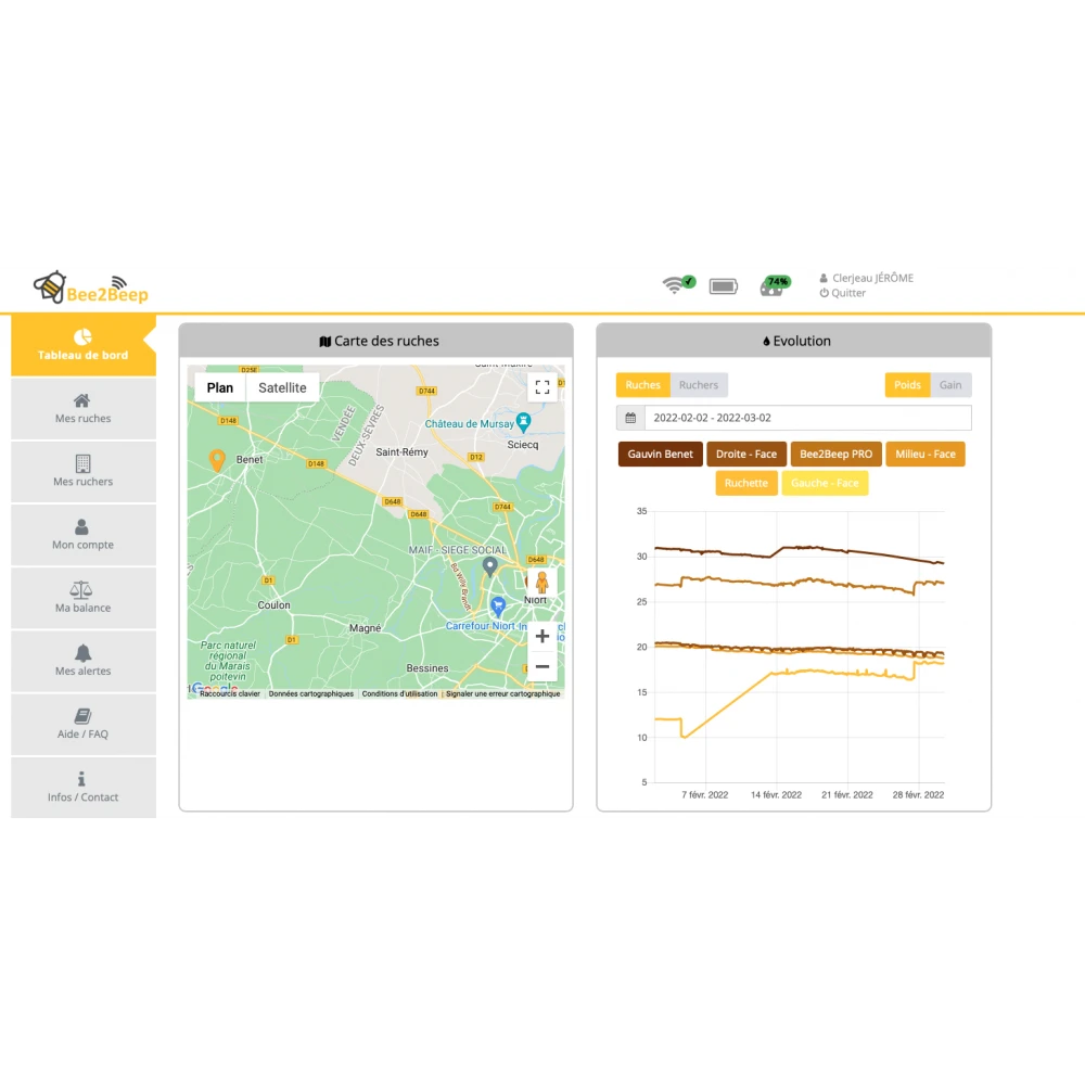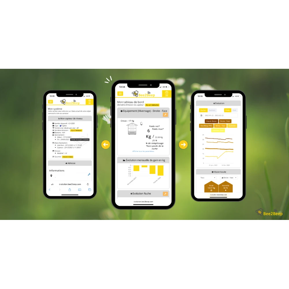 Grâce à la balance connectée Bee2Beep vous pourrez suivre en temps réel vos ruches où que vous soyez. La balance effectue 6 relevés journaliers. Au cours de la saison, vous pourrez ainsi surveiller la production, les disettes mais aussi détecter les essaimages. En phase hivernale, vous n’aurez plus à vous soucier de la quantité des réserves car vous aurez une information directe et précise sur le niveau de la nourriture restante dans la ruche.