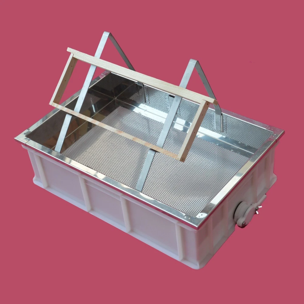 Bac à désoperculer à poser sur une table, avec bac en plastique alimentaire de 60x40x18 cm, Panier en tôle inox perforé, chevalet porte-cadre en acier inox et robinet clapet diam 40mm.