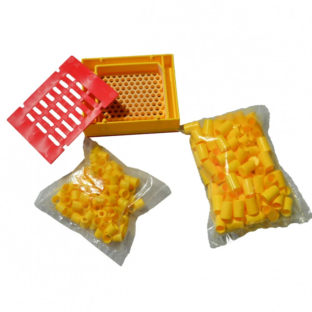 – 1 Boîtier d’élevage comprenant une face avec alvéoles et couvercle grille à reine où l’on introduit une reine afin de la faire pondre, l’autre face avec couvercle plein, donnant accès à des barrettes avec petits plots plastiques qui se déboîtent et qui permettent de récupérer des jeunes larves dans des cuvettes de 5 mm de diamètre, au 4ème jour après la ponte de la reine.