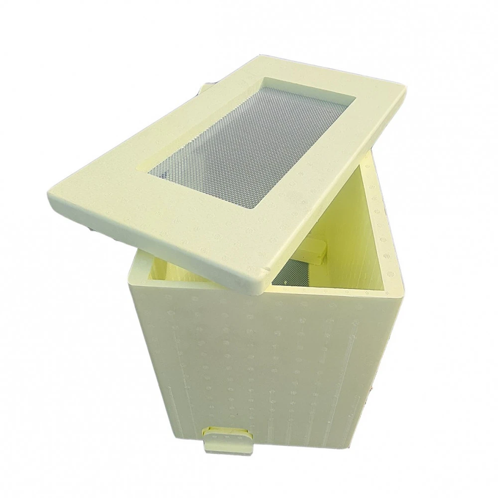 Fabriquées en polystyrène haute densité, avec un fond grillagé, Partitionnable avec 2 entrées, Toit Aéré pour le transport, Ces ruchettes sont idéales pour la vente d’essaims.